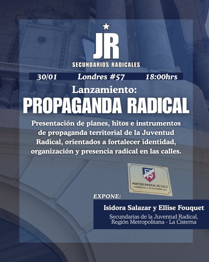 Lanzamiento de Propaganda Radical ideada por secundarios radicales. La actividad tendrá objetivo la presentación de planes, hitos e instrumentos de propaganda territorial.